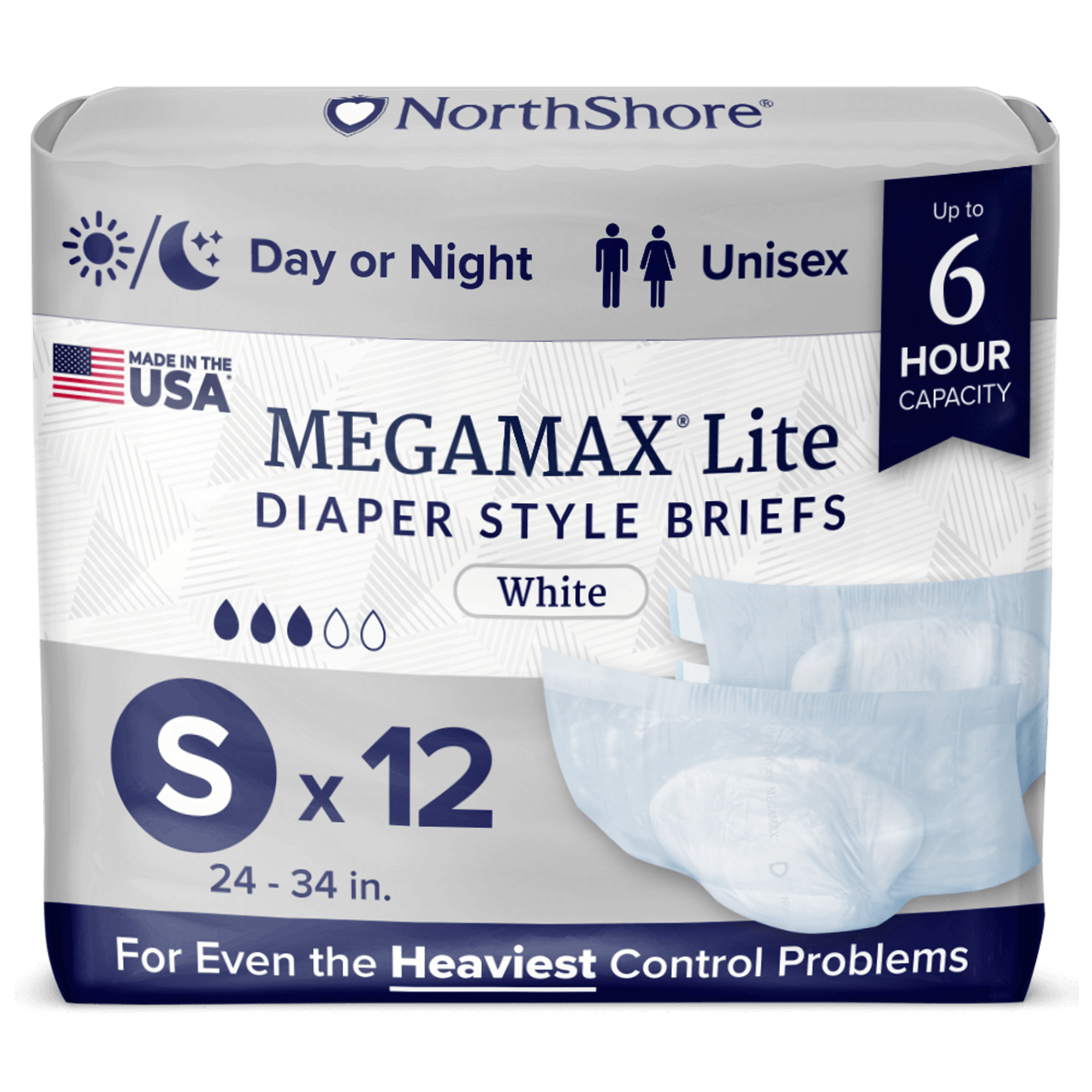 Designed for Heavy Bladder Leakage (HBL), MegaMax Lite offers the same extra-wide coverage and smooth plastic exterior as MegaMax Briefs in a lighter absorbency. Featuring MVP™ (Multi-Void Protection), the core keeps skin dry through multiple wettings for up to 6 hours of protection for bladder or bowel leaks. Proudly made in the USA*, these briefs stay secure thanks to heavy-duty refastenable tape tabs. Tall stand-up leak guards, leg cuffs, and waistband elastics protect against leaks from the leg openings and around the waist. Great for tackling daily chores and outings without the bulk of an overnight diaper.