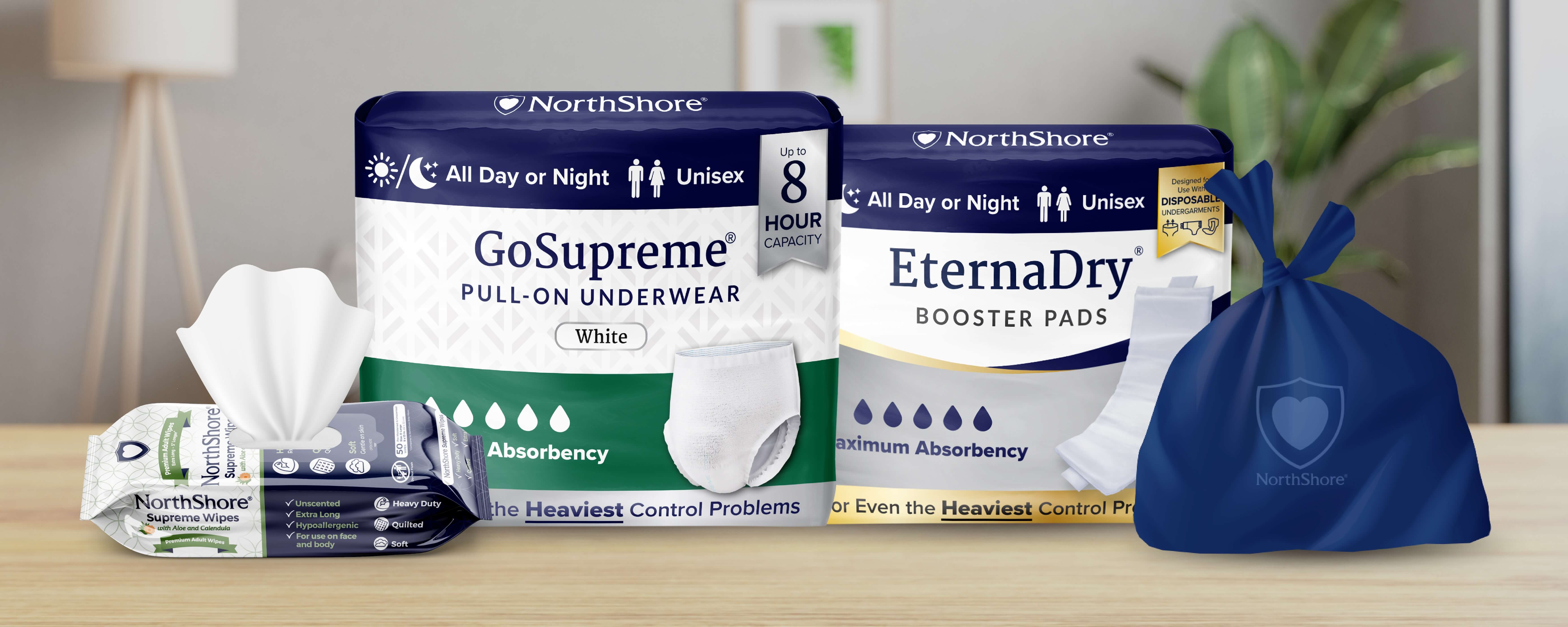 NorthShore’s incontinence care ecosystem (including adult diapers, liners, pads, boosters, underpads, cleansing wipes, and disposal bags) offers premium support for urinary and bowel incontinence for even the heaviest control problems.